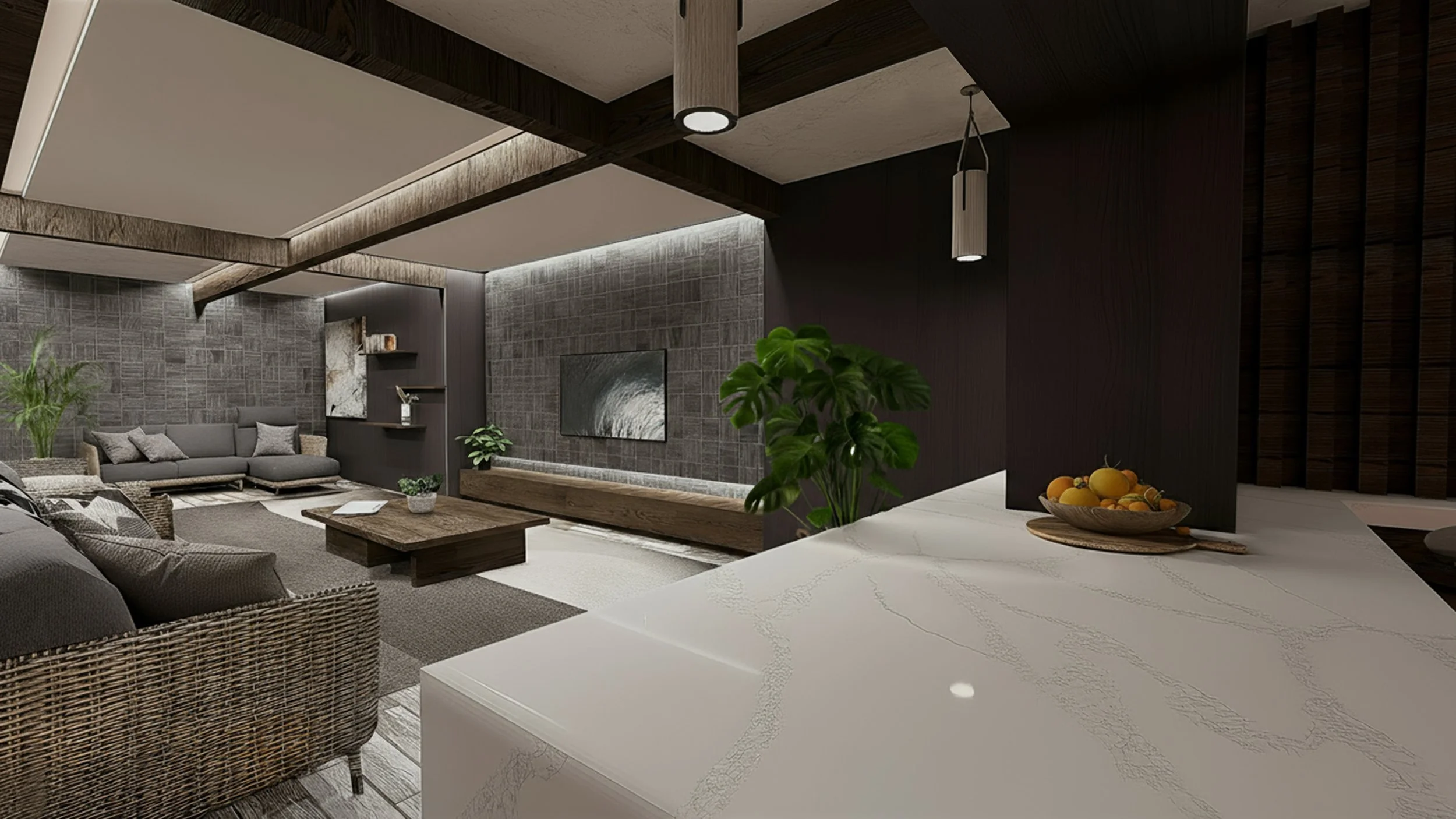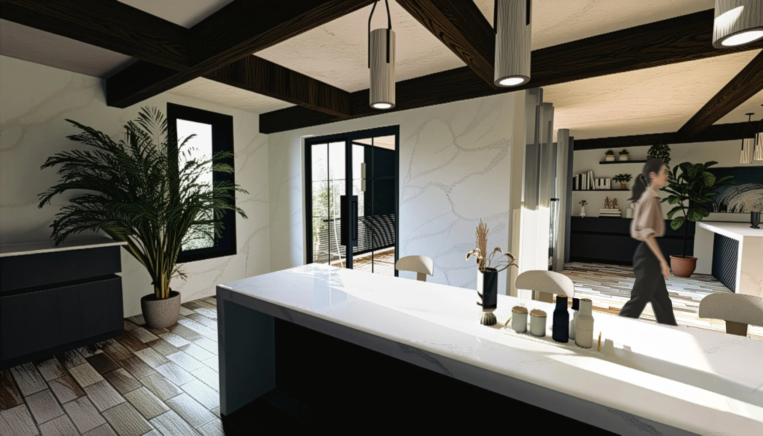 This design utilizes a rich material palette that includes veined natural stone, warm wood beams, and bespoke custom millwork. The design fosters a seamless open-concept living environment defined by thoughtful contrasts—such as the interplay between elegant tiling and plush furnishings—that results in a highly personalized and refined aesthetic.
